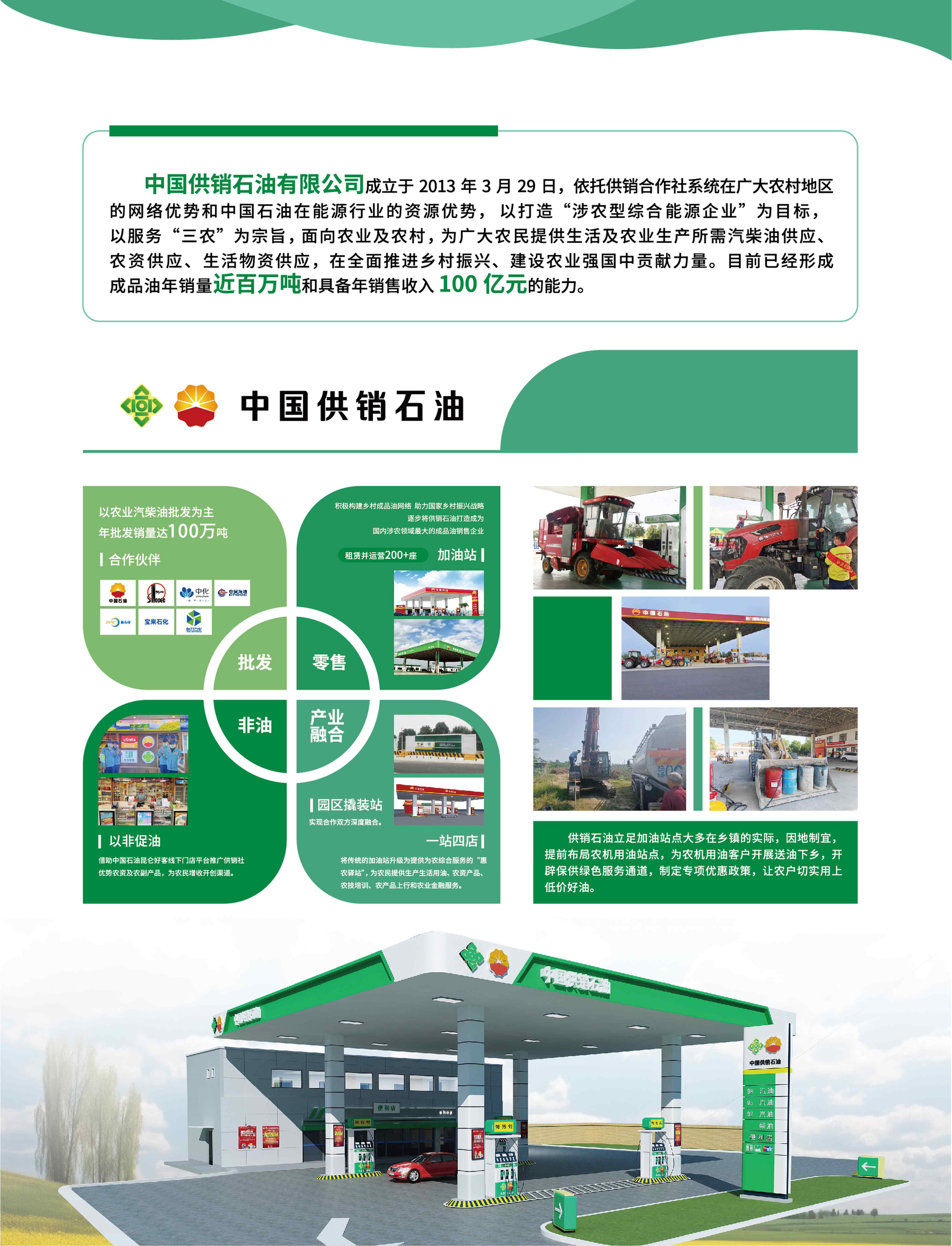 農用汽柴油板塊經營企業是中國供銷石油有限公司(簡稱“供銷石油”)。供銷石油成立于2013年,依托供銷合作社系統在廣大農村地區的網絡優勢和中國石油在能源行業的資源優勢,以打造“涉農型綜合能源企業”為目標,以服務“三農”為宗旨,面向農業及農村,為廣大農民提供生活及農業生產所需汽柴油供應、農資供應、生活物資供應,在全面推進鄉村振興、建設農業強國中貢獻力量。目前已形成成品油年銷量近百萬噸和具備年銷售收入100億元的能力。