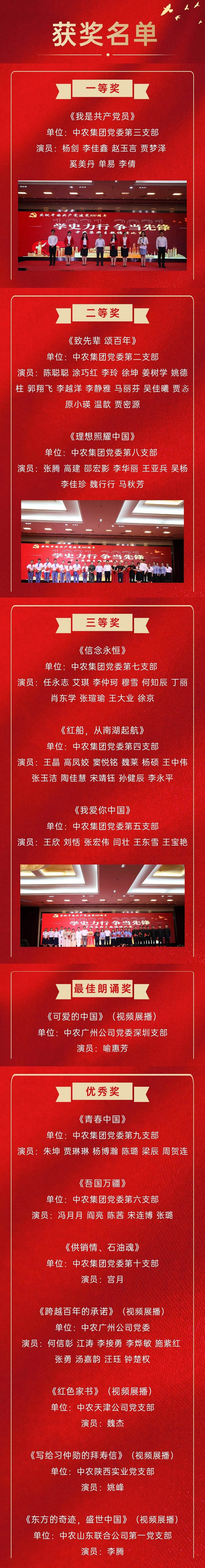 此外,由中農(nóng)天津公司黨支部朗誦的《紅色家書》、中農(nóng)陜西實(shí)業(yè)黨支部朗誦的《寫給習(xí)仲勛的拜壽信》、中農(nóng)聯(lián)合第一黨支部朗誦的《東方的奇跡、盛世中國(guó)》、中農(nóng)廣州公司黨委深圳支部朗誦的《可愛的中國(guó)》、中農(nóng)廣州公司黨委朗誦的《跨越百年的承諾》,都以鮮活的語言、飽滿的激情,表達(dá)了中農(nóng)人愛崗敬業(yè)的奉獻(xiàn)精神,情感真摯,打動(dòng)人心。