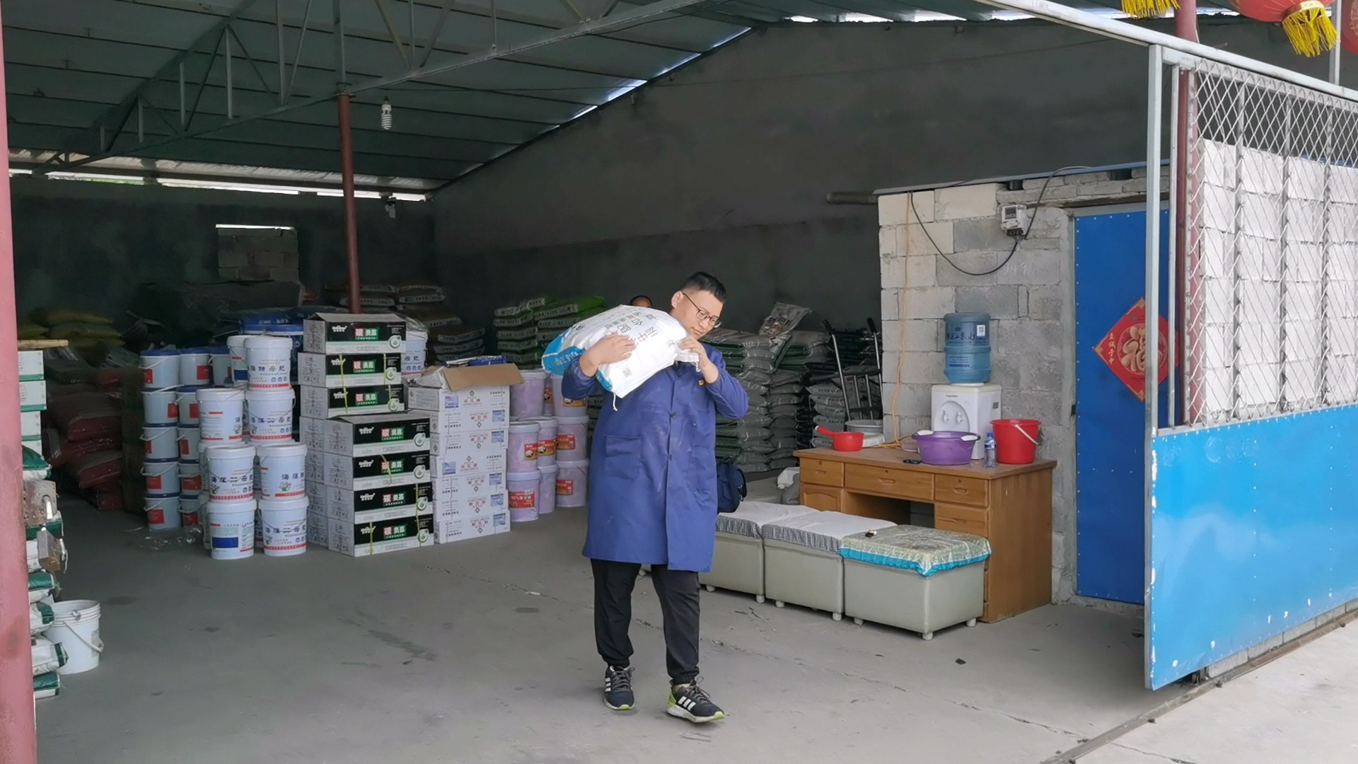 當記者在山東棲霞中農控股山東分公司的肥料直銷網點見到宋富海時,他身穿藍大褂,肩扛化肥袋,正在往農服車上搬運肥料,準備送往農戶家中。