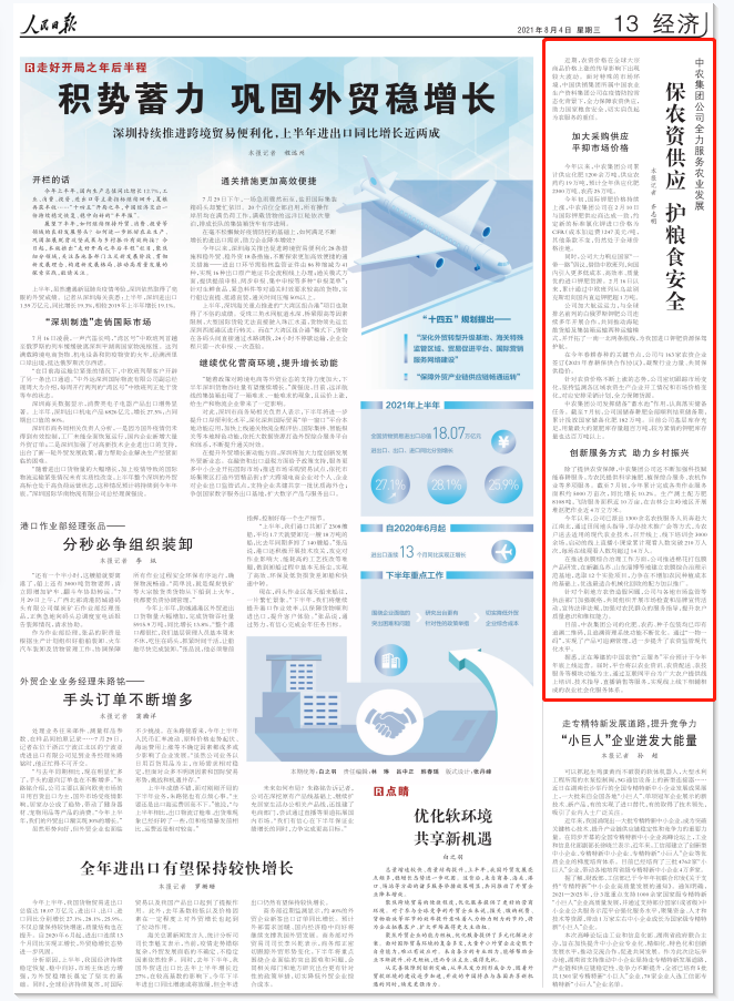 8月4日,《人民日報》第13版經濟版刊發《中農集團公司全力服務農業發展 保農資供應 護糧食安全》一文,報道了中農集團全力保障農資供應,助力國家糧食安全,切實肩負起為農服務的重任。