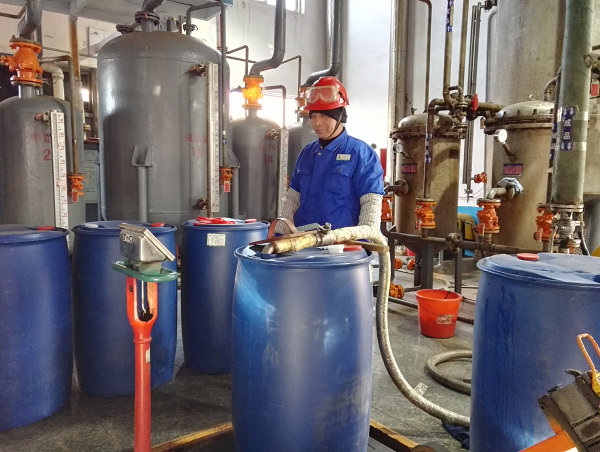 夏天,雖烈日炎炎,但勞動防護(hù)用品一樣可不能少,王師傅穿著工作服,戴著安全帽,脖子上搭一條毛巾,用來擦拭烈日下臉上的汗珠,汗水不一會兒就浸透了工作服;冬天,雖寒風(fēng)刺骨,王師傅依舊沒有忘記將勞保用品穿戴整齊。日復(fù)一日,年復(fù)一年,王師傅始終堅持,數(shù)十年都在做同樣的工作,始終如一毫無怨言,實在是難能可貴。十年以來,王師傅在灌裝崗位遵章守紀(jì),認(rèn)認(rèn)真真,從無怨言。使車間生產(chǎn)出來的乙酯成品能夠及時的灌裝入庫,保證了車間的生產(chǎn)。一個又一個藍(lán)色塑料桶,放在磅秤上,每一桶都灌上200kg乙酯成品,加上空桶重量,總共208.5kg,王師傅的磅秤永遠(yuǎn)定格在208.5這個數(shù)字上。