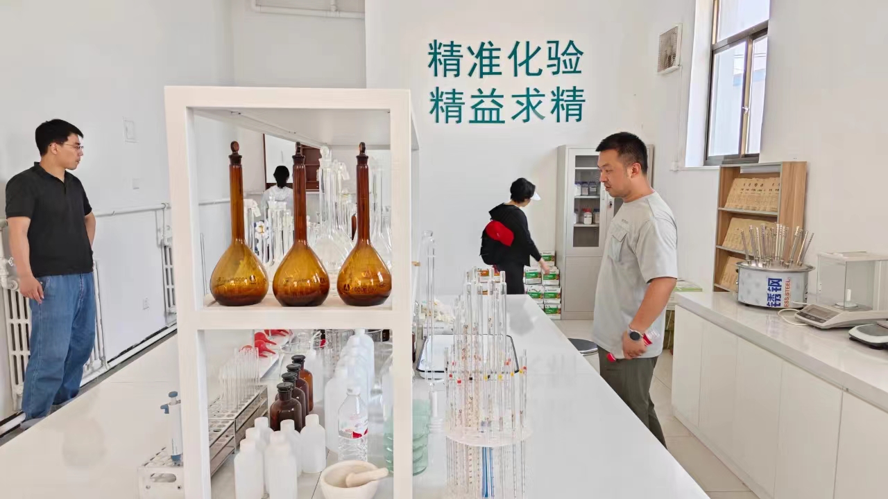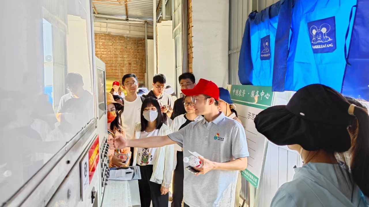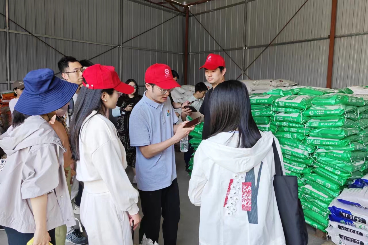 在中國農資·(平谷)服務中心,工作人員向青年干部職工介紹平谷服務中心概況,講解臭氧消毒機、水肥一體化控制設備、數字大屏、中農云APP、實驗室、配肥設備、機械設備等,與青年同志們進行交流互動。