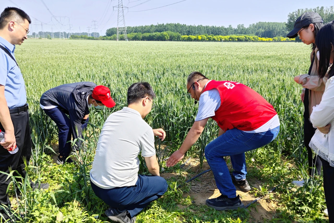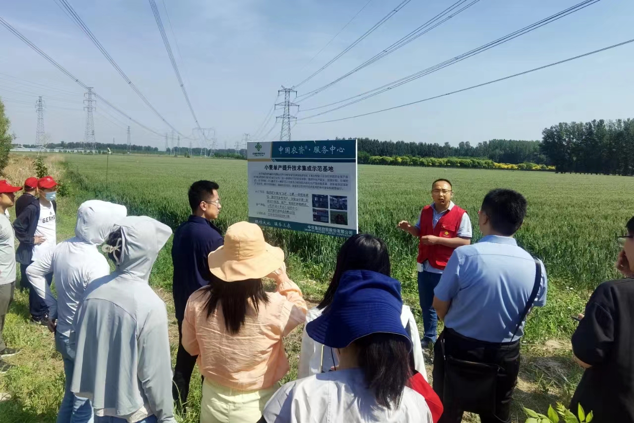 在中國農資·(平谷)服務中心小麥基地,工作人員向青年干部職工介紹小麥單產提升技術集成示范基地概況,講解如何通過監測站功能實現物聯網數據傳輸、建設智慧農業,青年干部職工參觀小麥田滴灌設施、物聯網監測站等,現場學習體驗如何辨別小麥長勢、如何科學噴灑農藥等技能。