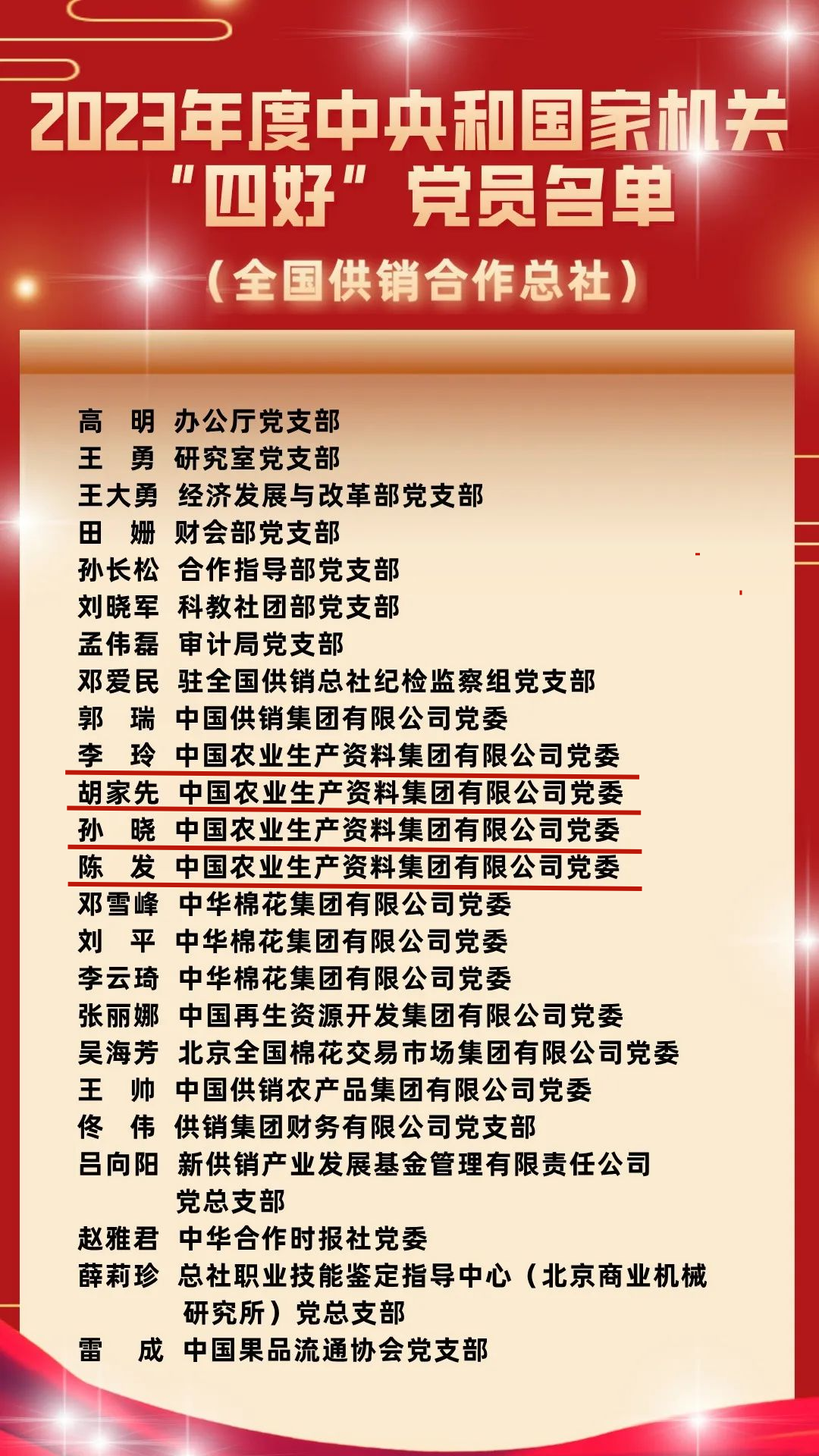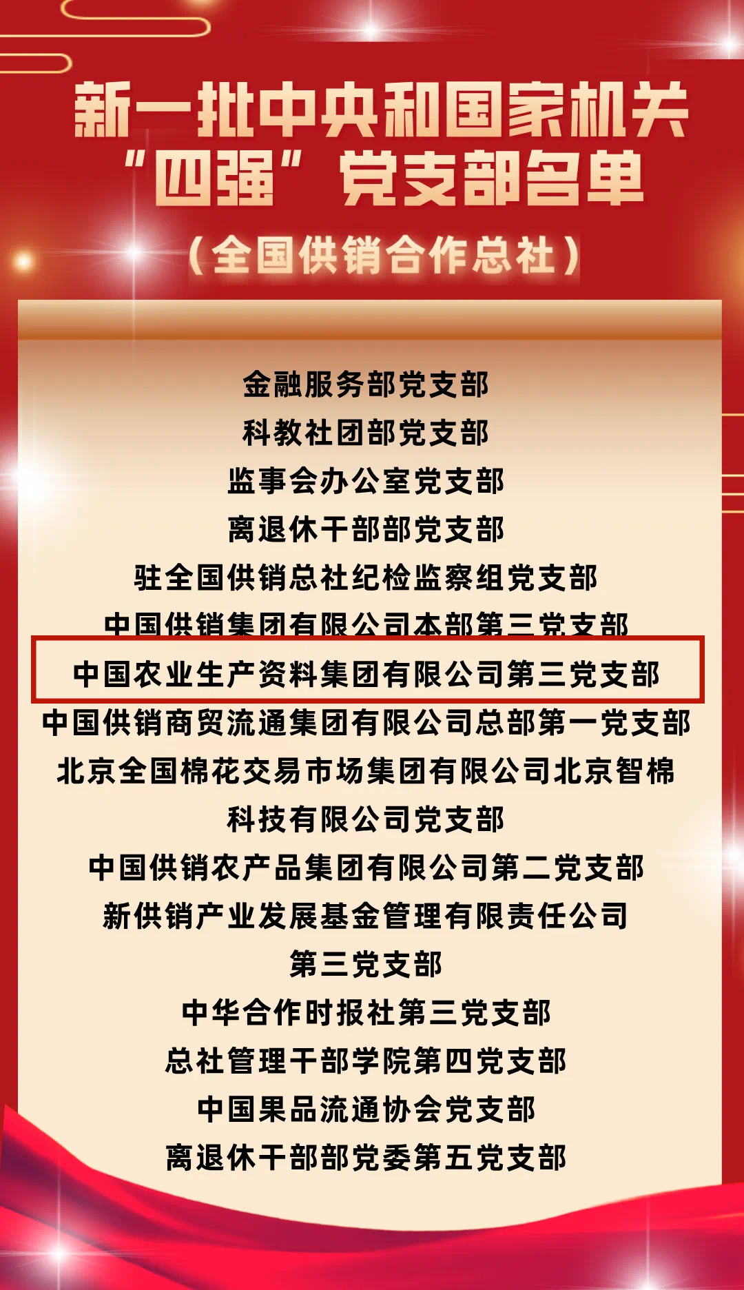 近日,中央和國家機關工委決定,命名新一批中央和國家機關“四強”黨支部、評定2023年度中央和國家機關“四好”黨員,中農集團第三黨支部被命名為中央和國家機關“四強”黨支部,李玲、胡家先、孫曉、陳發被評定為中央和國家機關“四好”黨員。