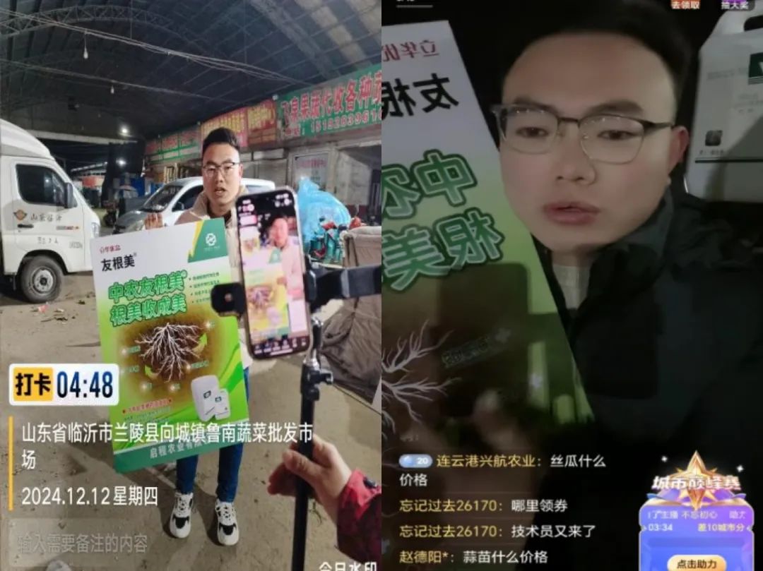 除了送關懷,張少馳還借助新媒體的力量。每天早上5點半,他都會和合作伙伴在蔬菜批發市場開啟直播,為農戶播報實時菜價。這一貼心的服務,讓農戶能根據價格合理安排采摘,深受大家歡迎。在直播過程中,張少馳也巧妙地融入“友根美”的介紹,提醒農戶關注作物根部健康,用專業知識和熱情態度,慢慢讓農戶對產品有了印象。