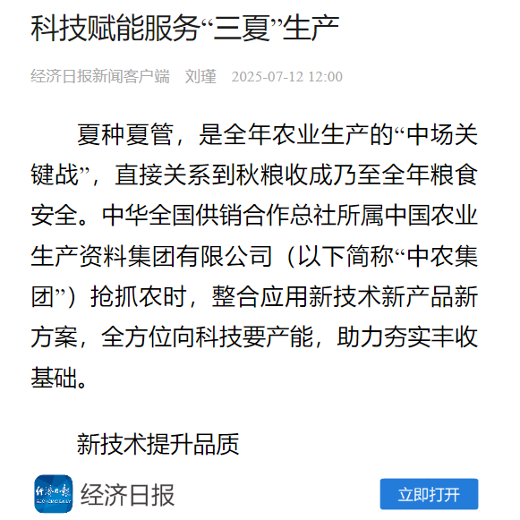 夏種夏管,是全年農業(yè)生產的“中場關鍵戰(zhàn)”,直接關系到秋糧收成乃至全年糧食安全。中華全國供銷合作總社所屬中國農業(yè)生產資料集團有限公司(以下簡稱“中農集團”)搶抓農時,整合應用新技術新產品新方案,全方位向科技要產能,助力夯實豐收基礎。