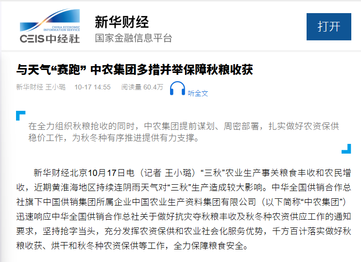 在全力組織秋糧搶收的同時,中農集團提前謀劃、周密部署,扎實做好農資保供穩價工作,為秋冬種有序推進提供有力支撐。